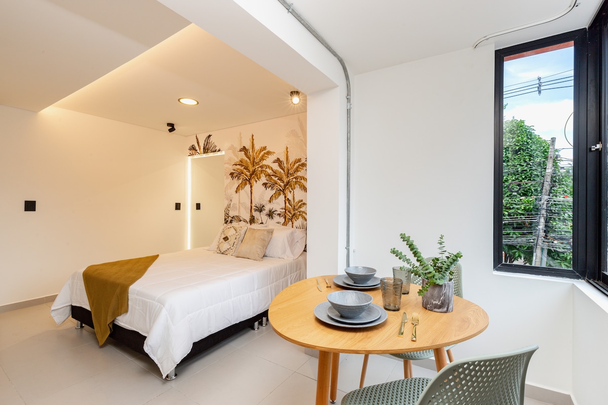 Welcome to your modern top-floor studio in trendy Laureles! Enjoy chic design, relaxing comfort, and a 5-minute walk to top dining and nightlife. This retreat includes 1.5 baths, full kitchen, A/C, in-unit washer/dryer, private + guest parking. Relax with fast fiber internet, Smart TV, and city views from your private balcony. With 24-hour security and spotless standards, peace of mind is assured. Perfect for digital nomads discover the best of Medellín in style and comfort.