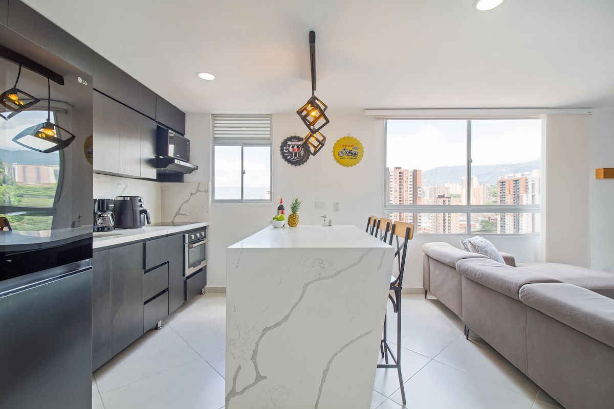 With breathtaking views of the beautiful city of Medellin, come enjoy this industrial chic loft home. Brand new construction finished in October 2021 including open floor concept living space and loft bedroom, fully equipped kitchen that is intricately designed with architectural modern touches. You will be in the beautiful mountainside yet with access to the inner city with public and private Transportation. Please note that the main road is currently under construction.