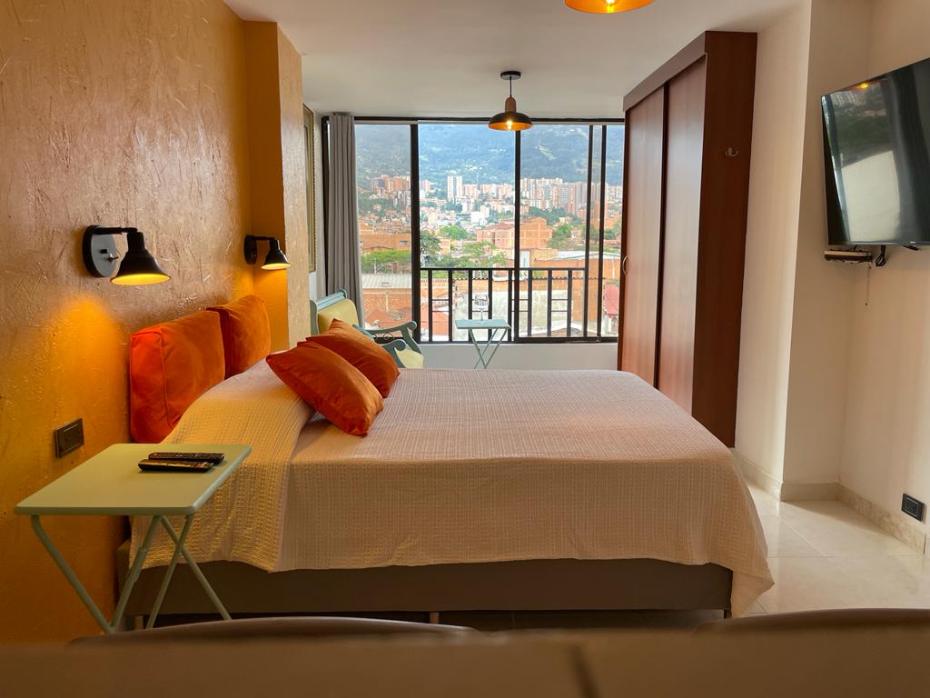 Suite completamente amoblada de 28 m2, con aire acondicionado y cocineta. Ubicada en una de las mejores zonas de Medellín, en un barrio muy tranquilo y cerca de todos los sitos de interés. La Suite cuenta con una vista espectacular a la ciudad y a las montañas. Podrás hacer uso de la zona de coworking, gimnasio y un espectacular café que ofrece diferentes tipos de bebidas a base del mejor café colombiano, podrás disfrutar de tu bebida en la terraza que se encuentran en el 2do piso del edificio.