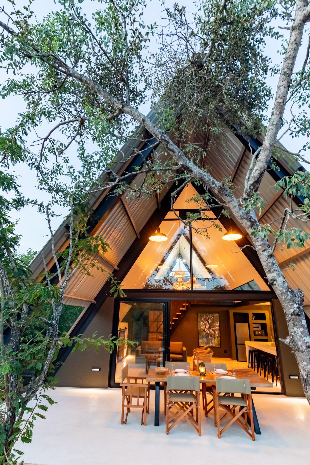 This unique place has a style all on its own.A modern A-frame house nestled in the heart of the bush, bordering the Kruger National Park in Marloth Park. This unique property promises a one-of-a-kind experience with a blend of modern and natural beauty. The house is bathed in natural light, courtesy of its high ceilings and large windows, creating an airy atmosphere. Clean lines and bright interiors define the contemporary design, providing a comfortable and stylish retreat.