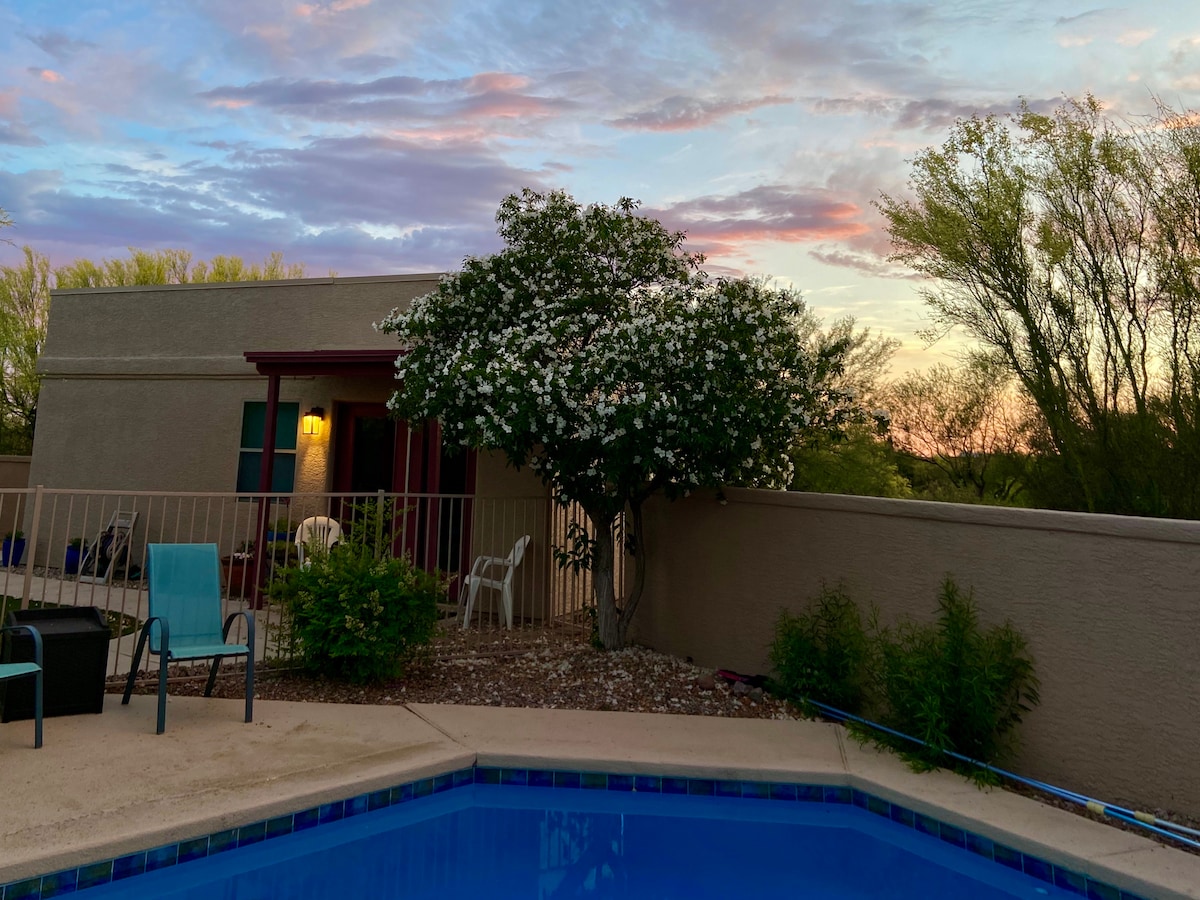 Escape the heat with our emerald pool! Stay warm with our fire pit! The northeast side of Tucson is the greenest scenery around town. You'll wake up in the morning greeted by the Catalina Mountain views and end the day with a breathtaking sunset that paints them orange. The newly renovated 1 bed/1bath guest house (studio) is situated in a quiet neighborhood, 15 minutes from beautiful Saguaro National park, less than an hour from Mt lemmon and tons of hiking, 30 min from downtown and the airport.
