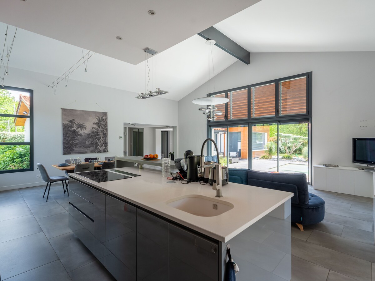 A 3kms du centre de Vieux-Boucau, située au coeur d'un airial, entourée de pins et de chênes lièges centenaires, cette maison est un véritable havre de paix, proche des plages de l'océan. Profitez d'un grand parc paysagé avec piscine chauffée, de ses grands volumes (la pièce de vie fait 60m2) et de la lumière incroyable qui filtre au travers des arbres. Idéale pour vous retrouver en famille ou entre amis, la maison accueille jusqu'à 15 personnes, reparties dans 5 chambres.
