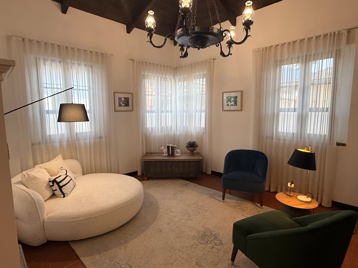 Indulge in luxury and tranquility within our spacious 3-bedroom, 5 1/2-bathroom house, offering breathtaking volcano views. Accommodating up to 10 guests comfortably, this historic 300-year-old house features original charm, a Spanish terrace, and both indoor and outdoor gardens. Cozy up by the fireplace and relish the unique experience, just two blocks away from the central park and one block from the mercado de Artesanias. Your unforgettable getaway awaits—book your stay now!
