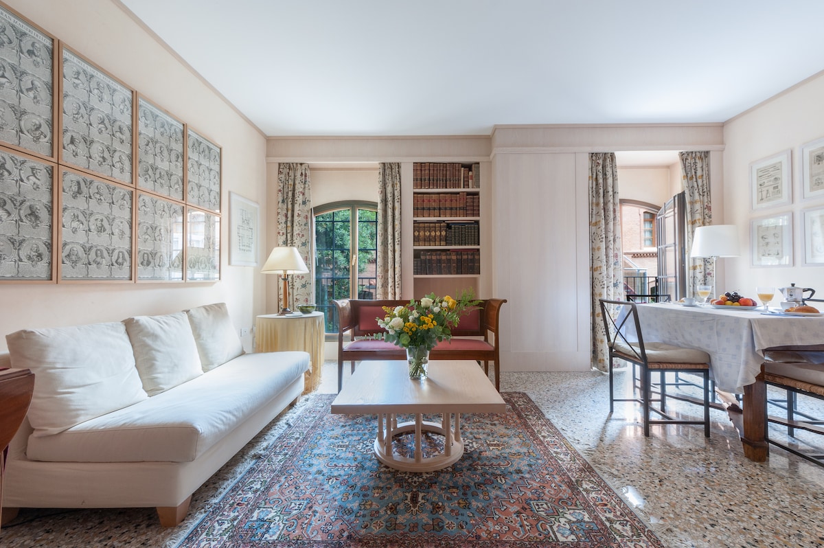 Admire the beauty of Venice from the arched windows of this welcoming and spacious apartment which combines historical elements, such as wooden beams, and contemporary furnishings. From the large windows you can enjoy a beautiful view of the canal, crossed by gondolas, and of the typical Gothic buildings of Dorsoduro, the most authentic district of Venice, appreciated by artists and intellectuals of all ages; equipped with two bathrooms and every comfort, you will find books and art objects.