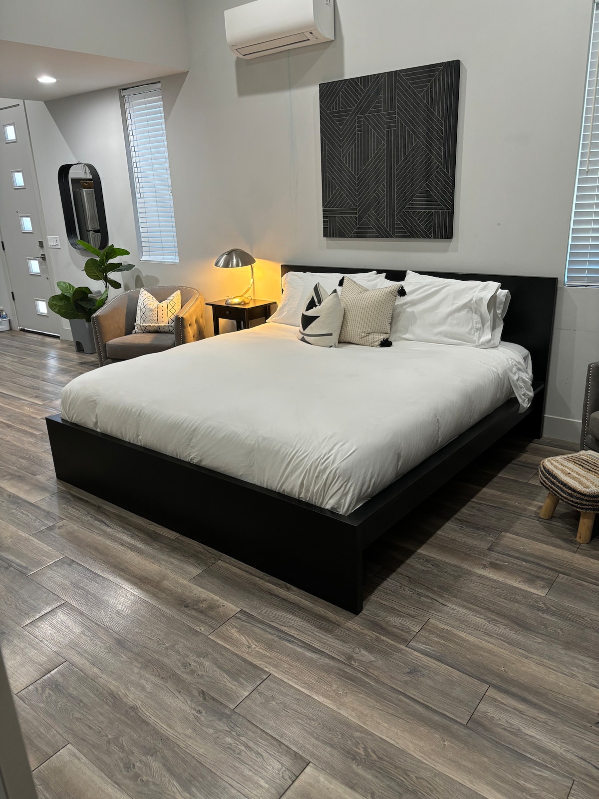 This ground floor unit has 1 spacious bedroom and 2 bathrooms in addition to a large, open kitchen-dining-living room area. We work hard to keep the unit clean and the modern design and white finishes show that. All linens and towels are white and bleached between uses. The unit is fully stocked with additional cleaning supplies under the kitchen sink. City of Sacramento Short-Term Rental Permit #02117P