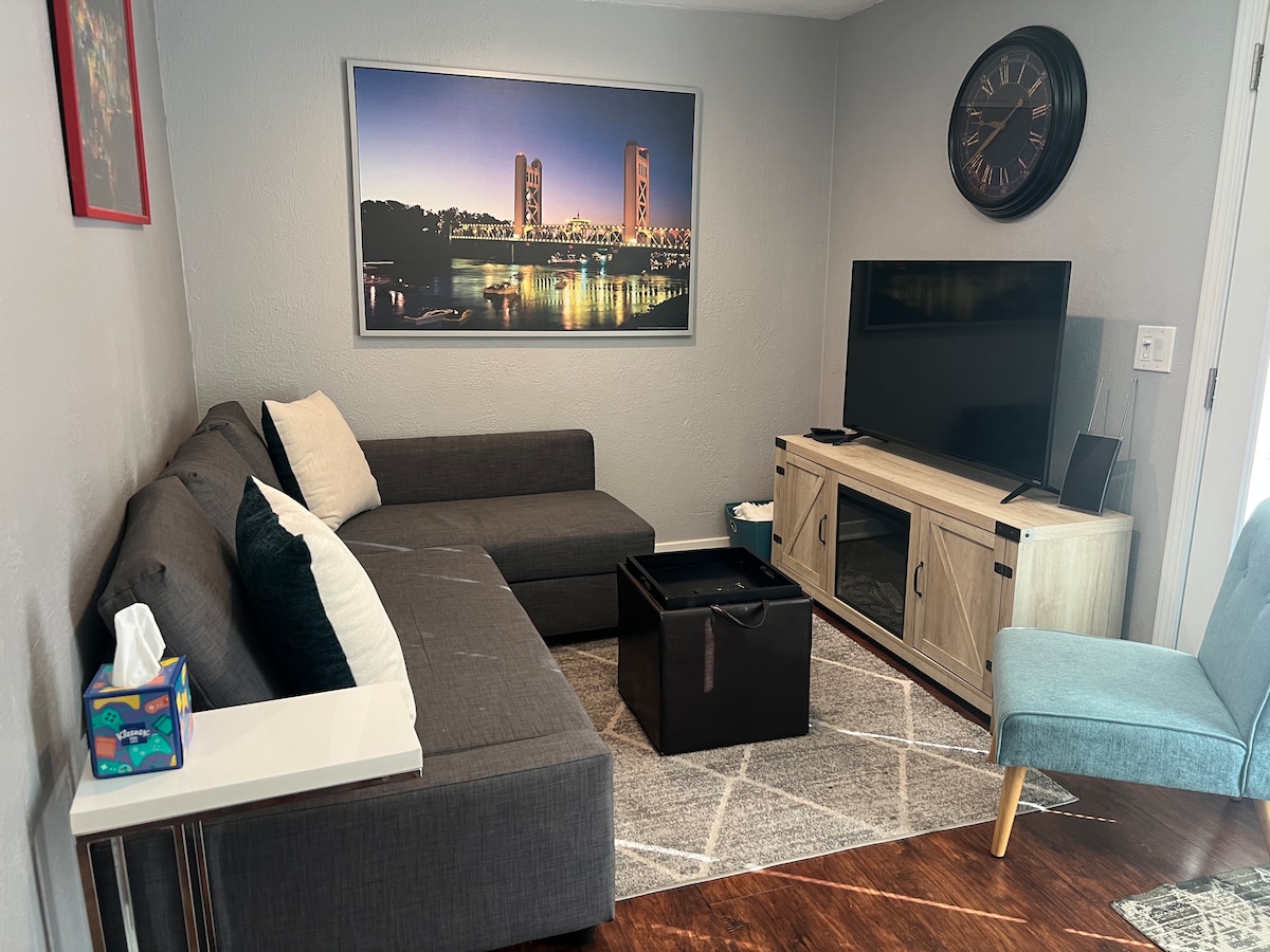 This stylish newly renovated 1 BR in-law unit has anything you need to feel at home. Enjoy a king bed, 55" smart TV, cozy nook with a twin bed, washer/dryer, level 2 EV charger, garden with flowers, vegetables and fruit trees. Fully equipped kitchenette and dining space. Close to midtown, downtown, Golden One, Cal Expo, Discovery Park, shopping, restaurants, freeway and light-rail. Near numerous hospitals. Baby gear available. Hiking & river access nearby. Day trips to SF, Tahoe, Napa & more.