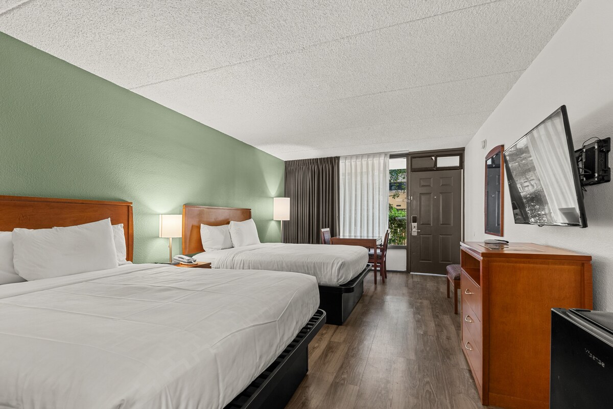 Our one bedroom with two Queen size beds located in Downtown Sacramento at the Vagabond Inn Executive Sacramento is walking distance to Golden 1 Center. The room features two queen beds, desk, large flat screen TV,, microwave, and mid size fridge. The private hotel room has an exterior corridor entrance, 24-hour fitness room and newly renovated swimming pool and hot tub. The property is located right on the edge of downtown making it easy to go for scenic walks beside the river.