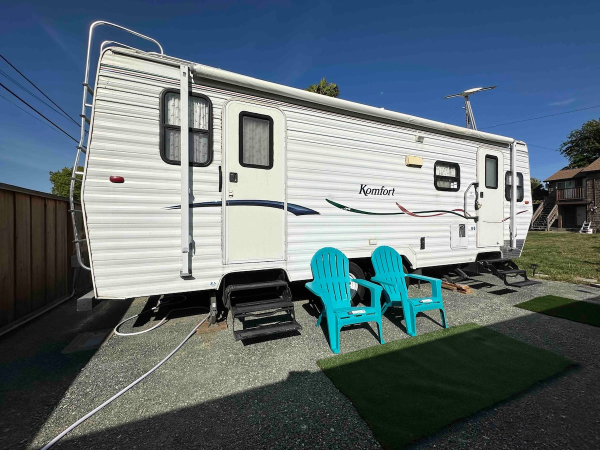 A great place to stay to visit family or a business trip or both. Centrally located for many different activities. Private bedroom with a queen bed and TV. Bathroom with shower. The kitchen is fully equipped for making meals but close to additional eateries. Two work spaces. This is a stationary RV. Starbucks, Walmart and Costco all within easy walking. Public Transit. Additional rules NO SMOKING Self check-in with lockbox Check in 4pm Check out 11am Quiet time from 11 pm to 7 am.