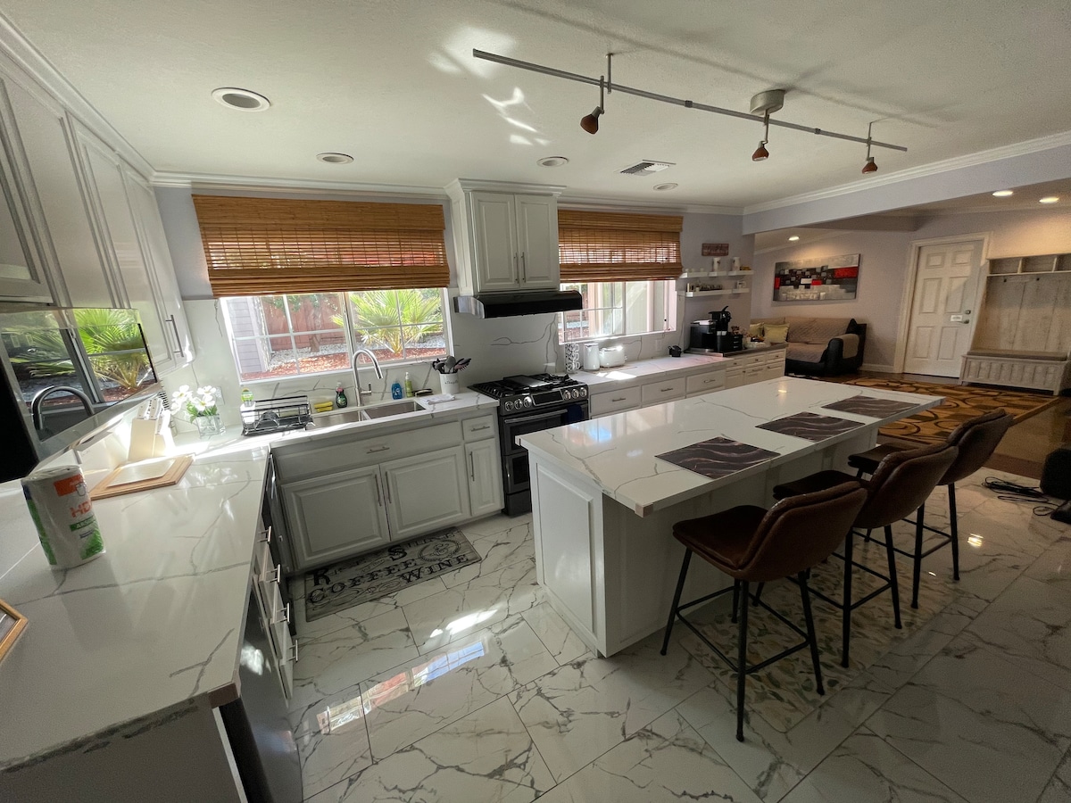 ✨ Relax in this remodeled 3-bed, 1-bath home on a spacious 7,000 sq ft lot. 🍳 Modern kitchen with quartz counters, full backsplash, a large island with bar seating, and premium appliances. 🛋️ Cozy living room with a 65” TV, plus ceiling fans and 58”, 55”, and 42” TVs in the bedrooms. Premium mattresses, fresh paint, and beautiful wood floors throughout. 🛁 Newly remodeled bath 🌳 Large yard in a peaceful neighborhood — perfect for families, work trips, or anyone seeking comfort and serenity.