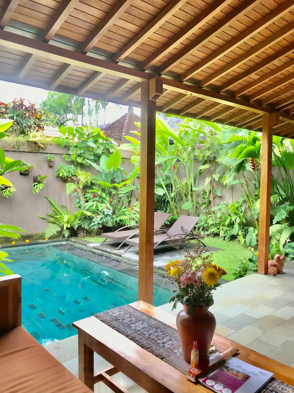 Stunning open living room, 8 m to ridge & seamless private pool laid w/10000 white stones. Reclaimed 100 yr old HAND HEWN TEAK JOGLO. A thatch roof & heritage tiles. We are in a Hip Hilly neighborhood with NO CARS. Walk 5 min and up 30 steps to Passiflora. We RECOMMEND using our drivers who will carry bags. We have a rice paddy as part of your garden-our commitment to Bali. Walk to Alchemy Yoga & Plant Bistro 10 min Ubud 20 min. For FIT FOLKS. Enjoy 1 -30 min .Foot Massage. Our Gift!