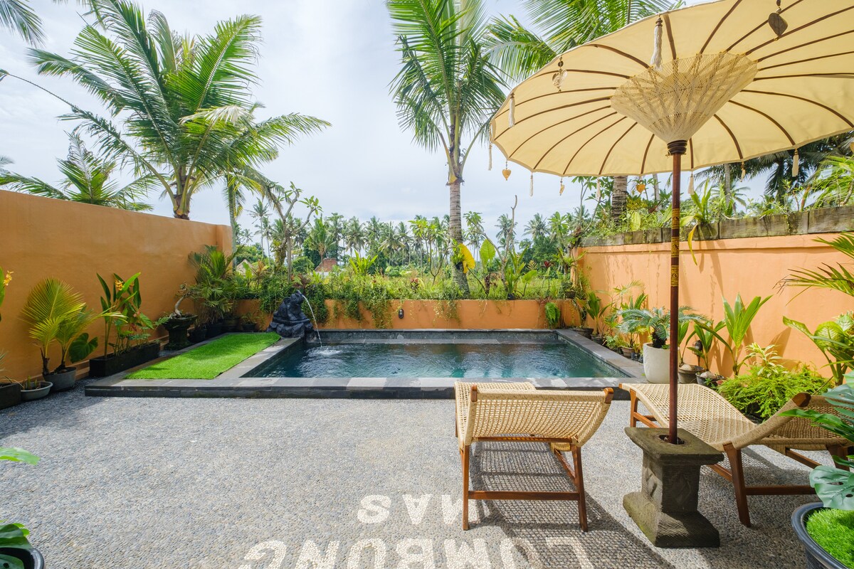 Villa 1 kamar Tidur dengan kolam renang Pribadi dengaan view Tebing yang indah, terletak hanay 5 menit dari Pusat Ubud menjadikan Villa kami sebagai tujuan yang tepat untuk berlibur. menyediakan facilitas lengkap mulai dari kompor, alat masak dan kulkas ddan wifi gratis .