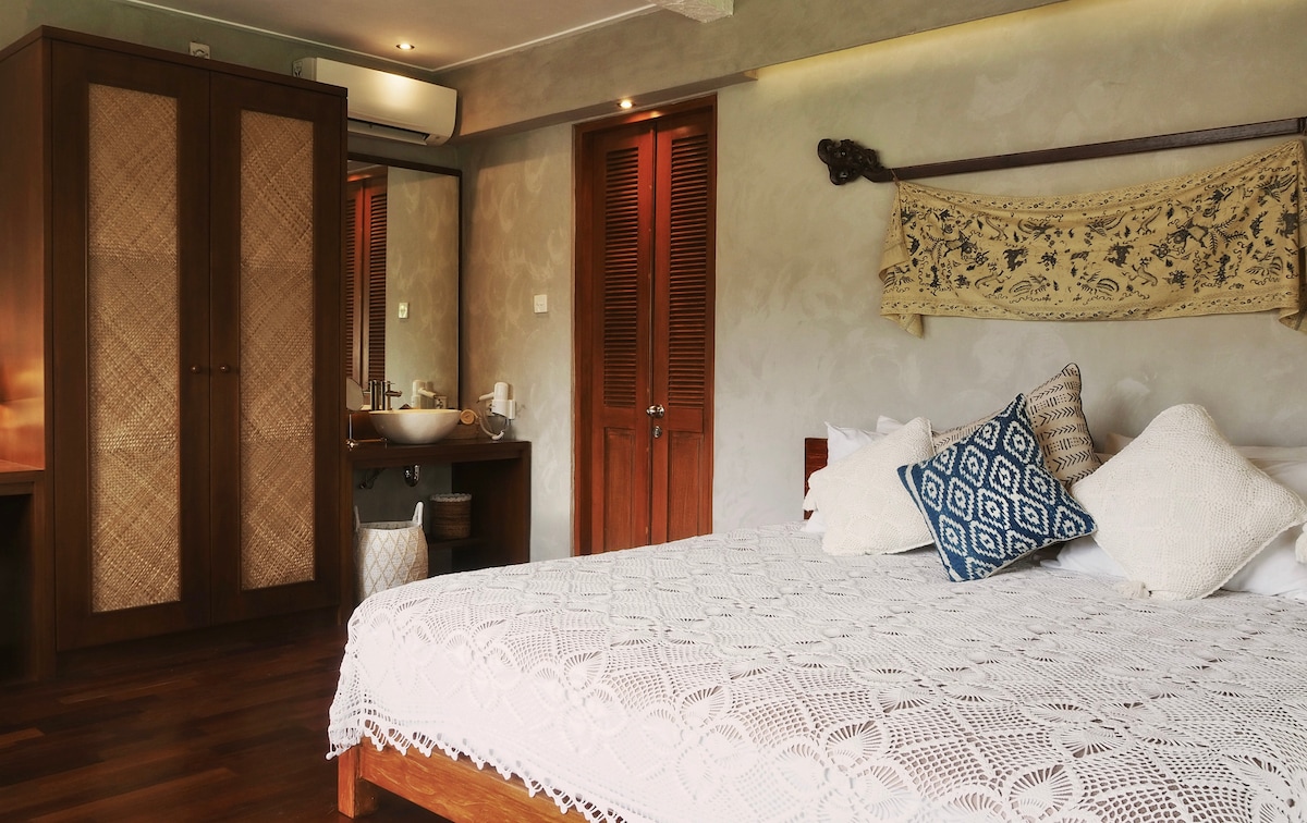 A luxurious classical Balinese escape. Leave the modern world behind to immerse yourself in private luxury and discover the essence of Bali in a natural playground alive with green fronds & sweet coconut aromas. The hum of Mother Nature rejuvenates you as shadows play across statues in the garden. Escape to this bespoke Balinese-style suite and feel the old gods of the island whisper to your soul. Unearth the true Heart of Bali in unique privacy. Warm smiles await you. Book your stay now.