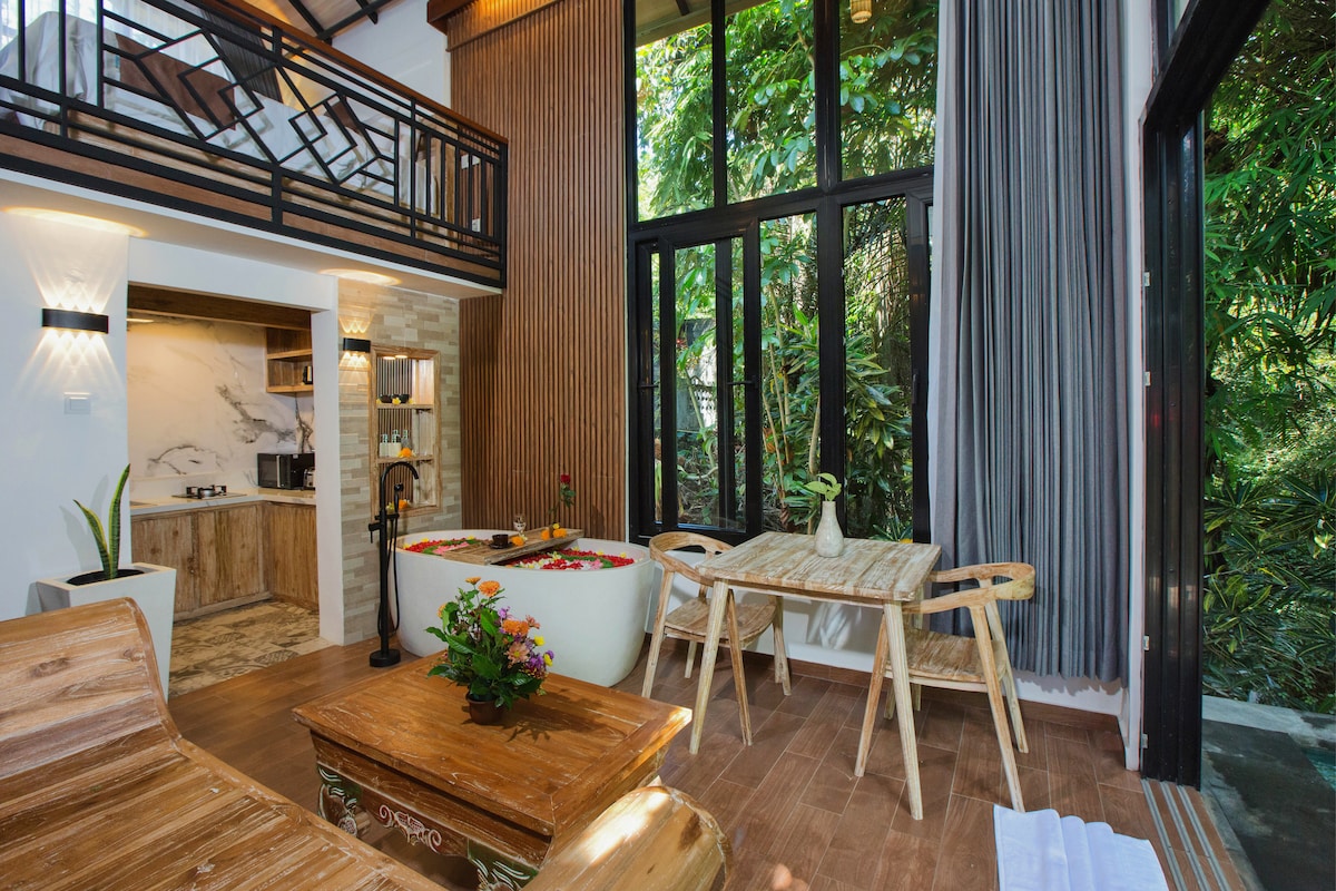 Escape to a serene haven nestled amidst lush greenery. This loft-style villa boasts a king-size bed on a raised platform, overlooking a private infinity pool that blends seamlessly with the jungle view. The ground floor features a spacious living area with a dining table, a well-equipped kitchen, and a stylish bathroom with a bathtub and shower. The large floor to ceiling windows create an inviting and tranquil atmosphere.