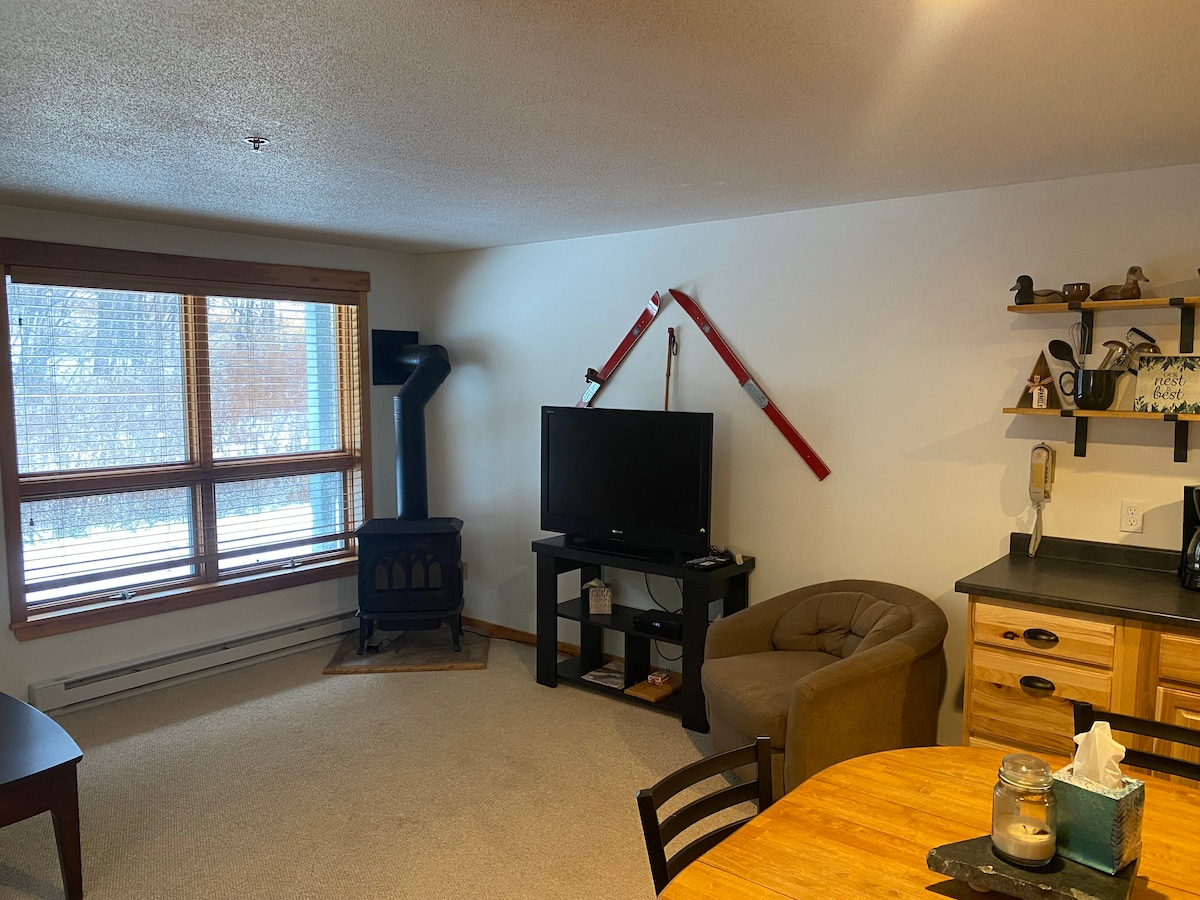 This two-floor ideally located condo is on the mountain between Barker and White Cap Lodges. You can ski in/out using Roadrunner trail, which is right across the parking lot. There is plenty of parking and the condo is located in Building 2, which is closest to the common lodge area with a fireplace and pool/hot tub/sauna access. While this is technically a 1 br, there is a wall between the queen room and the full/twin room for privacy, and a queen size murphy cabinet bed in the living room.