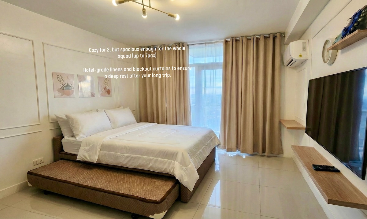 Experience a smart cozy/modern condo living that make your stay comfy and relaxing. Enjoy your morning/afternoon coffee at the balcony with a perfect unwinding seaside view and Mactan island. The unit has 50" smart TV/sorround soundbar and lazy boy chair, watch Netflix and Youtube like in a movie house . High speed WIFI (fiber) for your internet related concerns. Smarthome powered by google home. It has mini bar with mood lightings for bar feels dining and drinking. Keyless smart doorlock🏠