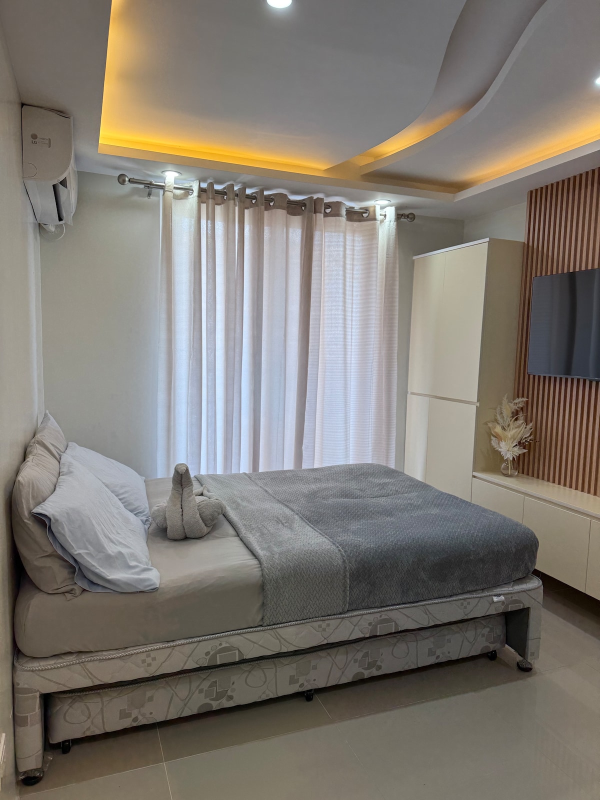 Enjoy a stylish experience at this centrally located place. Relax in this entirely cozy, modern and vibrant condo unit that is conveniently located near Mactan International Airport. Where it is close to everything like restaurants, coffee shops, laundry shops, malls and supermarket. - 3-5 minutes away from Mactan Airport - High-Speed Internet up to 200 Mbps - 65 inches TV with free Netflix - 1 Bedroom w/ 1 queen-size bed & 1 Foldable double size bed - Washing Machine -Fully equipped kitchen