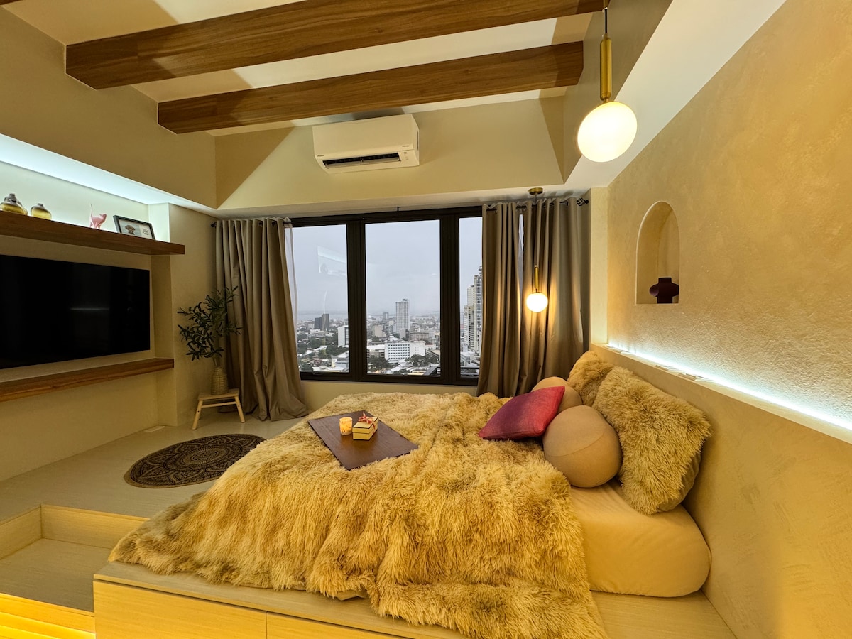 Snuggle up in this calm, Elegant fusion of Zen-Industrial inspired 27sq.m studio unit at 16th Floor which is located in an understated area in Lapu-Lapu City, that is easily accessible from Mactan Cebu int'l Airport (13 mins ride), public markets, churches, and 7/11 on site. It is an Ideal options for travelers' looking for reasonable-priced lodging to visit Cebu, Note: The Guest in Excess of 3 will be using the floor mattress Provided. Location: Saekyung 956 condo Looc Lapu-Lapu City
