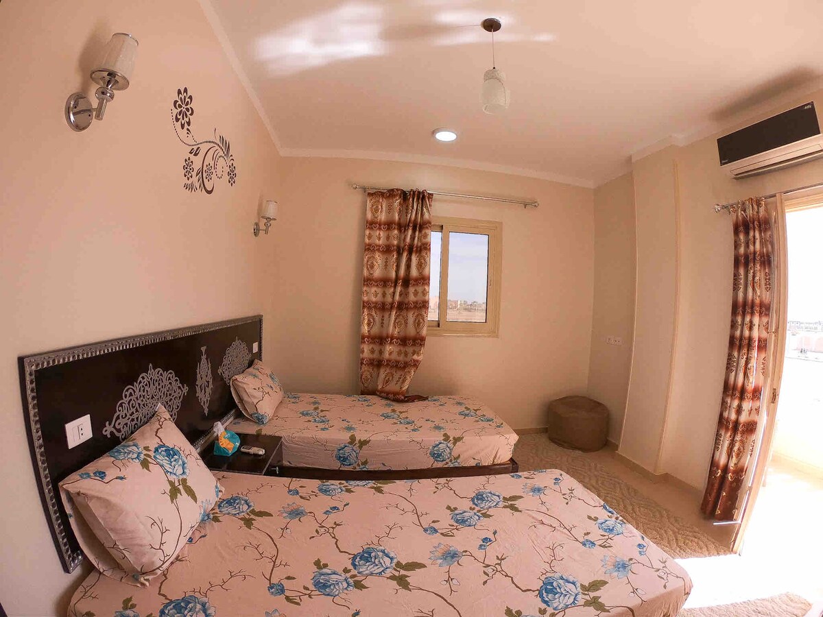 Holiday retreat located in Soma Breeze compound, Somabay is Egypt’s top holiday destination, amazing Snorkeling and Diving spots, Beaches, Golf fields, Kite Surfing, Aqua Park, Carting, Quad Bike, Restaurants, Supermarket, Bars with live music, Horses stable, SPA, music concerts. Apartment is on the 3rd floor which allows a very beautiful Sunny terrace with beautiful sea and mountain views. PS: There is a construction site 100m in front of the apartment, the work in the site ends at 4:30 PM.