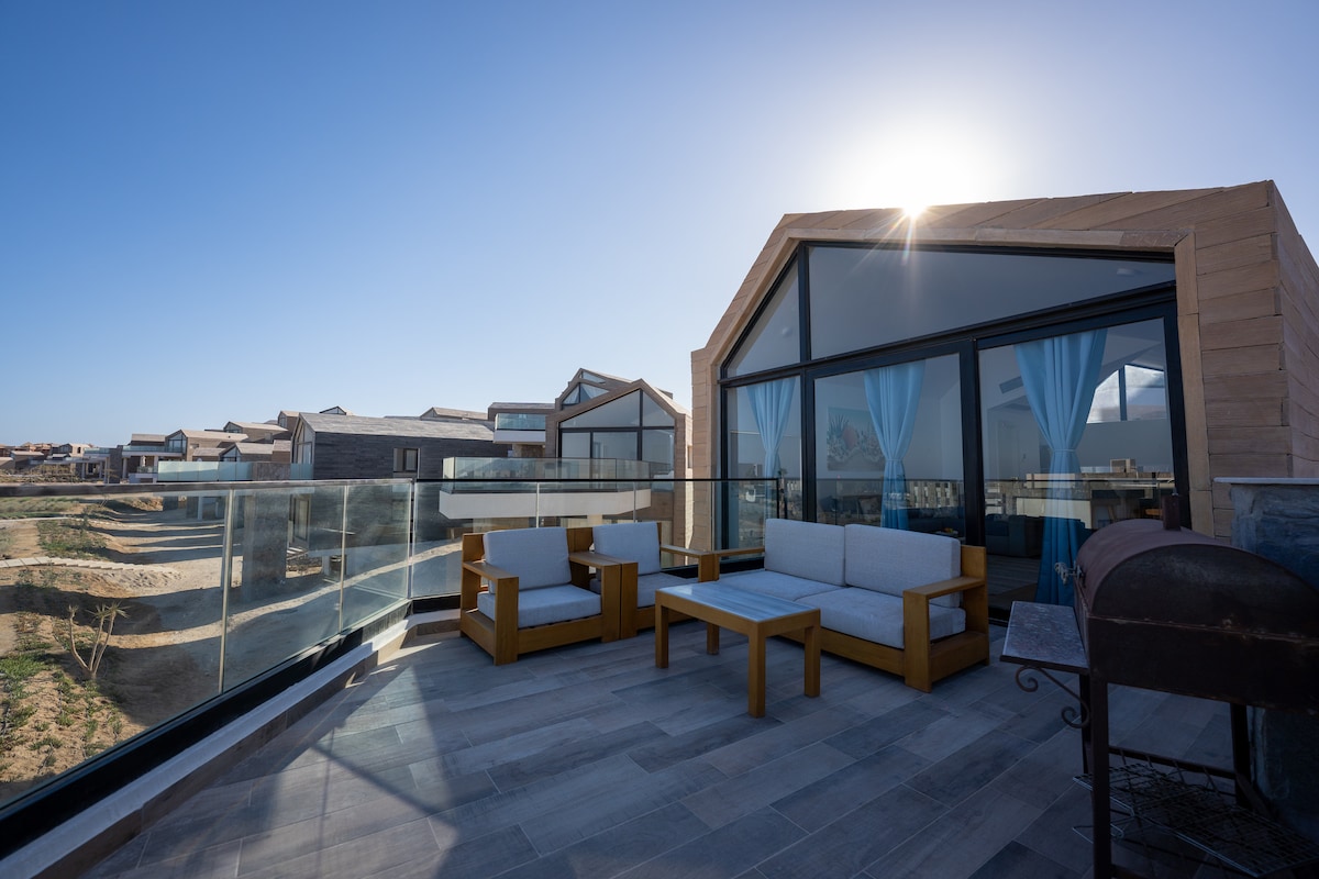 Stylish loft with stunning views of Mesca’s sandy Beach, at a walking distance, through its floor to ceiling windows, steps away from the lagoon and pool. An ideal spot to enjoy the beach, explore the nearby amenities like the kite house, horse stable, golf park and tennis/padel courts or simply unwind in comfort on the outdoor swing. Free access to:lagoon, baywest pool, Mesca beach Bike & skateboard available to explore Cozy living space and a fully equipped kitchen enjoy the beach lifestyle