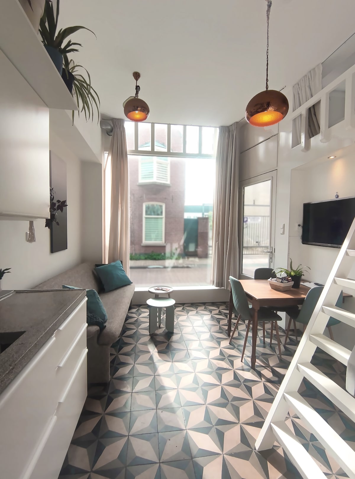 A one of a kind suite with own entrance, situated on the ground floor of a old shop building in which Joris and his kids have their home. With shop windows and original floors, this tiny-house-within-a-house is offering all for a lovely getaway. Beautifully renovated by the owner itself, the loft is the perfect hideout in the middle of the old central district of Tilburg, boasting many shops, restaurants and bars. A comfortable loft fully decorated for 3 persons, and that on only 25m2!