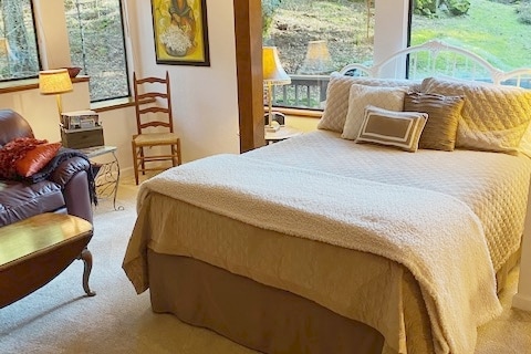 The meadow, creek, and redwoods are stunning! Country setting 12 minutes to Calistoga, Napa Valley or Santa Rosa! Beautiful views, listen to water, and have coffee from your deck with table and chairs. Watch deer through a wall of private windows! Plush carpet, granite counter tops, fireplace, large flat screen TV, Netflix, DVD, books, yoga equip. Electric gate opens to beautiful acreage. High-quality, bedding. Large space, kitchen area, Keurig/cups or drip coffee maker, your own BBQ and washer