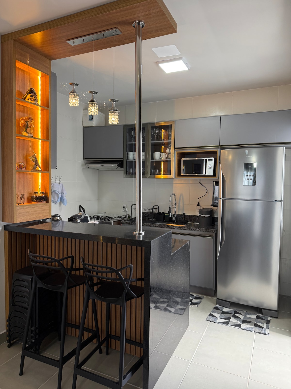 Apartamento composto por sala integrada com a cozinha, 1 (uma) suíte, 1 (um) quarto, banheiro social, varanda e área de serviço. Comporta até 6 pessoas. Dispõem de 2 (duas) camas de casal e 2 (dois) colchões de solteiro, ares-condicionados em cada quarto, lençóis, toalhas, acesso Wi-Fi, televisão, sofá, geladeira, fogão, mesa e utensílios de cozinha. Além disso, possui uma vaga de estacionamento, guarita 24 horas, churrasqueira (mediante reserva e pagamento de taxa).