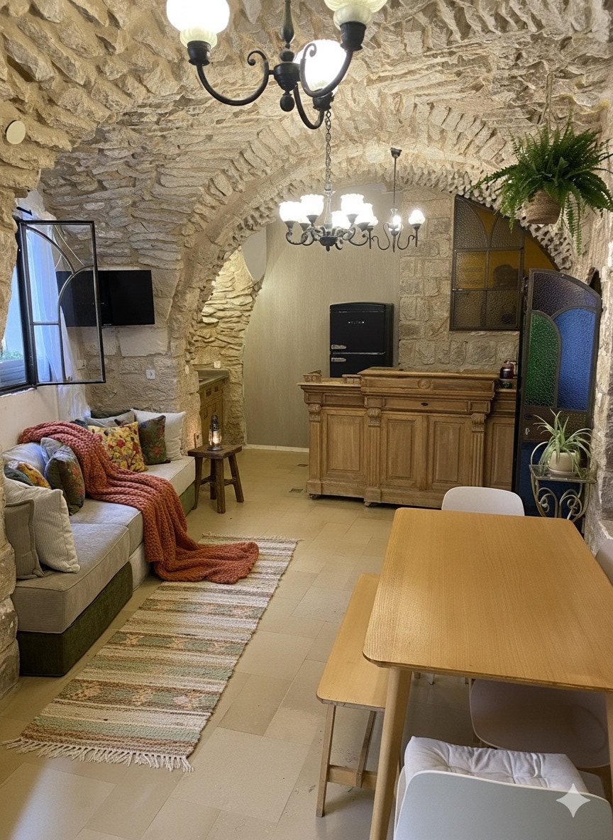 Located on Jerusalem street in the heart of the old city of Safed, within a short walking distance of variety of shops, restaurants, synagogues, art galleries and more.. A breathtaking view to Meron mountains that can be seen from the living room, bedroom and balcony. The kitchen is fully equipped with a fridge, microwave, coffee facilities, shabbat equipment, dishes, etc.. We provide towels, linens, a baby crib, toiletries. There is AC in every room and free WiFi. free parking on site.