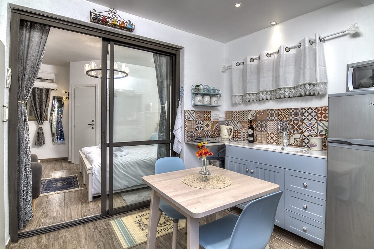 בסמטאות העיר העתיקה במרחק הליכה קצר ממסעדות, חנויות ובתי כנסת שוכנת סוויטת בוטיק זוגית עם ג'קוזי מפנק, מיטה זוגית יהודית, מטבח, פינת אוכל ופינות ישיבה מרווחות. חלל השינה בנוי מאבן צפתית אותנטית עתיקה, שילוב מדויק של מודרני ועתיק. חוויה מיוחדת במינה