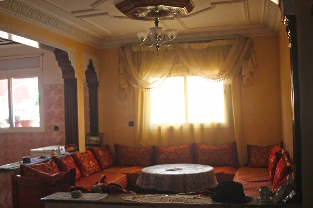 Je mets à votre disposition un luxueux appartement 150 m2 dans un quartier calme au centre de la ville safi zone villa ouvert sur une belle vue d une magnifique terrasse contenante une fontaine traditionnelle entourée par des pots de fleurs avec une table à manger décorée de zalij marocain pr passer un bon moment et profiter de soleil il contient 2 chambres à coucher,un salon très moderne,cuisine bien équipée (machine à café,cuisinière etc,)connexion wifi et un tv 65 pouce