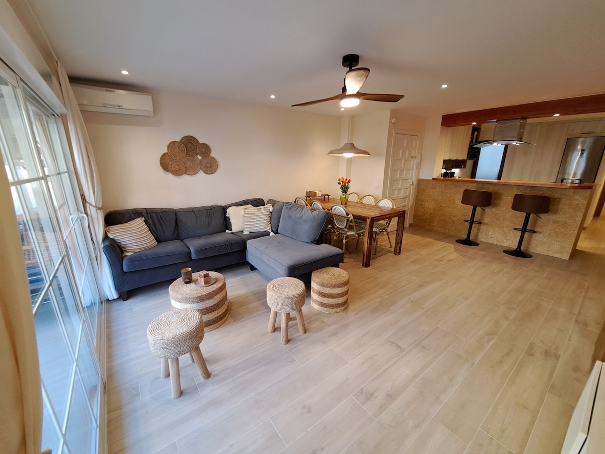 Excelente apartamento en planta baja, con gran terraza a 20 metros de la playa completamente nuevo, con todas las comodidades, con wifi, aire acondicionado, cocina completamente equipada con todo, microondas, tostadora, batidora, cafetera, etc…, baños de primera calidad con inodoro inteligente, con secador, disponemos de gel y champu, 2 habitaciones excelentemente decoradas estilo mediterraneo, también dispone de sofa cama en el comedor. Disponemos de cargador electrico de coches a 20 metros