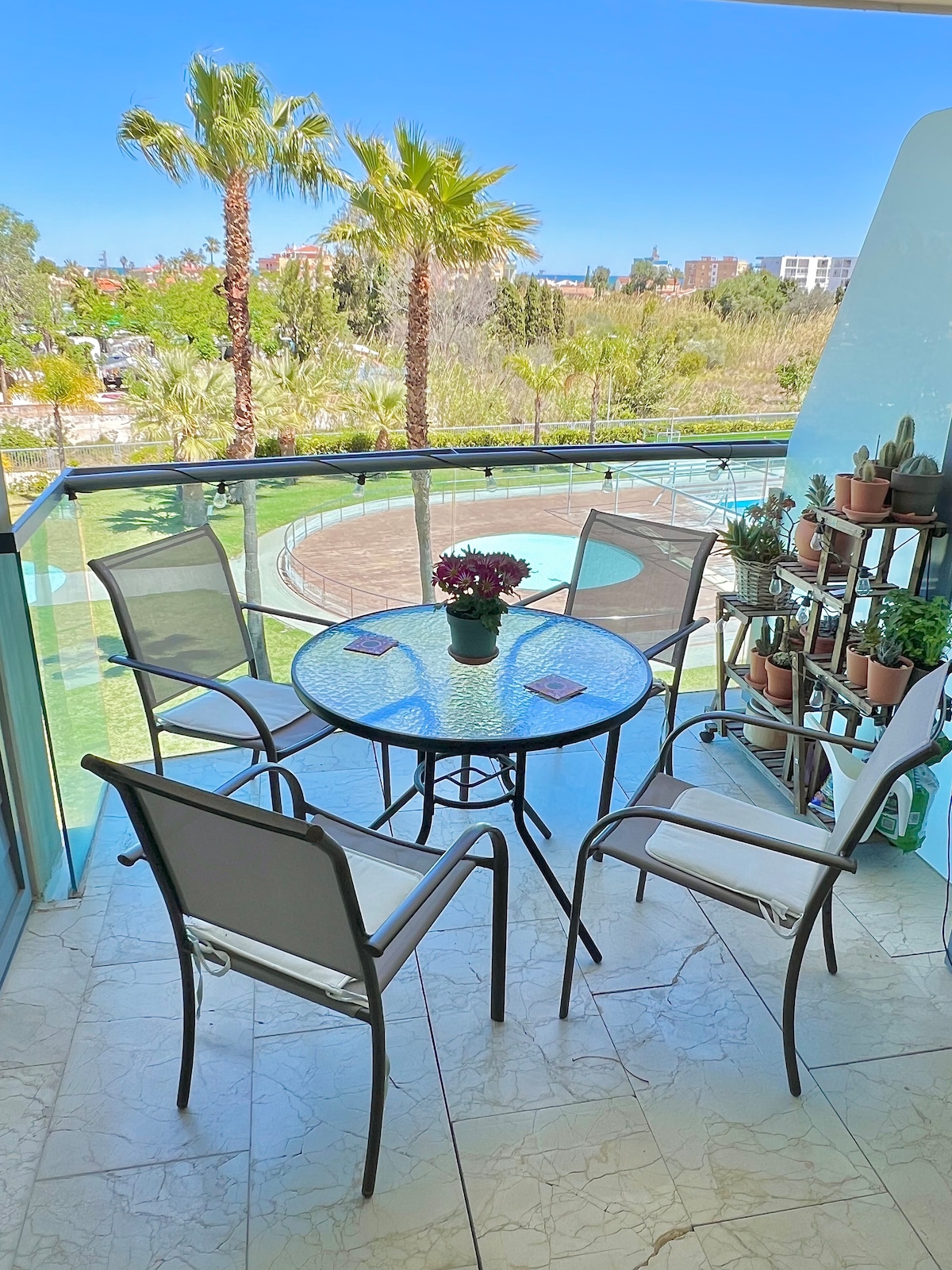 - Magnifica urbanización a 450 metros de la playa - 5 piscinas exteriores con jacuzzis y piscina climatizada, pistas de pádel, tenis, baloncesto y futbol, zona de barbacoa, plaza de parquin cubierto, zona infantil, gimnasios y saunas (1 euro por hora para el uso de la sauna) - Cuarto piso con amplia terraza con vistas a las montañas y piscinas en una zona alejada del ocio nocturno ideal para familias con niños - Cocina completa totalmente equipada y salón con sofá cama para dos personas.
