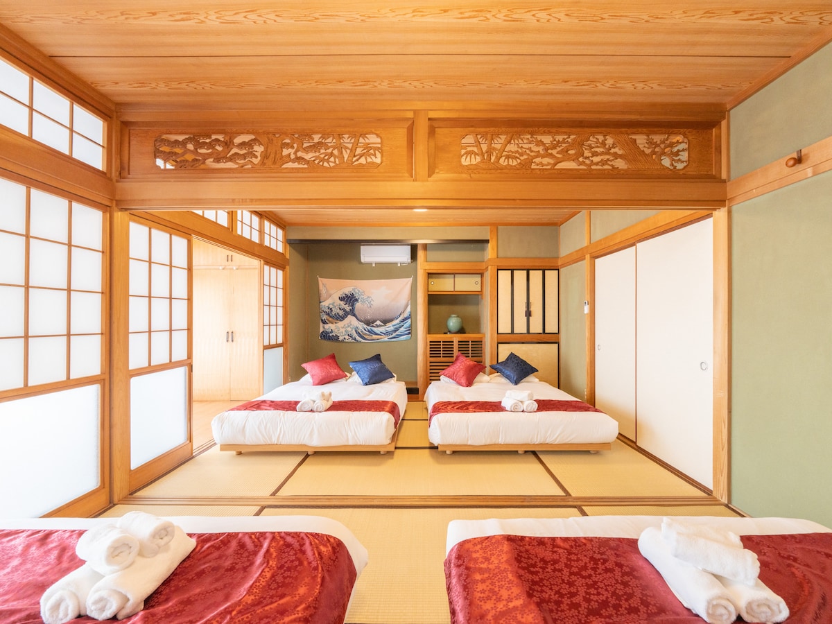 本格的な日本庭園を備えた伝統的な二階建て和風建築です。 100年ほど前に夫の先祖が建てた家を、幾度か改築し現在に至っています。4年前にキッチン、バスルーム、リビングルームをフルリノベーションしました。 敷地は広く、1270平方メートル(テニスコート4〜5面分)です。静かにのびのび過ごせます。 BBQ🍖.卓球🏓,ダーツ🎯.手持ち花火など、ご家族、お友達、グループでのご利用に適しています。 2023年に敷地内駐車場🅿️を整備しました。車は6台ほど停めることができます。 カーナビゲーションを利用して来られる場合は、『篠原ホームサービス』と入れて検索して下さい。OSAHOUSEは、その裏です。『篠原ホームサービス』の右横の細い道を10mほど進むと、OSAHOUSE専用駐車場です。 施設の近くにある商業施設 ① 24時間営業のスーパーマーケット  Trial GO(徒歩5分) ② ラーメンやすたけ(徒歩2分) ③ 寿司レストラン はま寿司  (徒歩10分) ④ LAWSON(徒歩6分) お客様貸し出し自転車2台あります。すぐ前にLuupもあり!