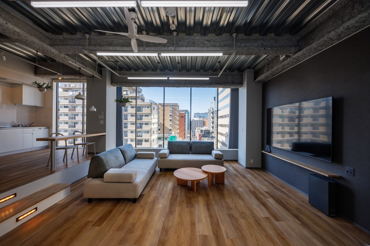 This extra high ceiling 24 sq.m loft apartment is well equipped and designed to make your stay comfortable & homely. Tenjin subway station, Akasaka station, Tenjin bus station, and Nishitetsu Fukuoka station are 10-11 minutes walk away, making this room a perfect base to explore Kyushu. Suitable for families with young & older kids, & groups. Surrounded by local restaurants, cafes, convenient stores, and shops with great access to public transportation. A parking lot is right next