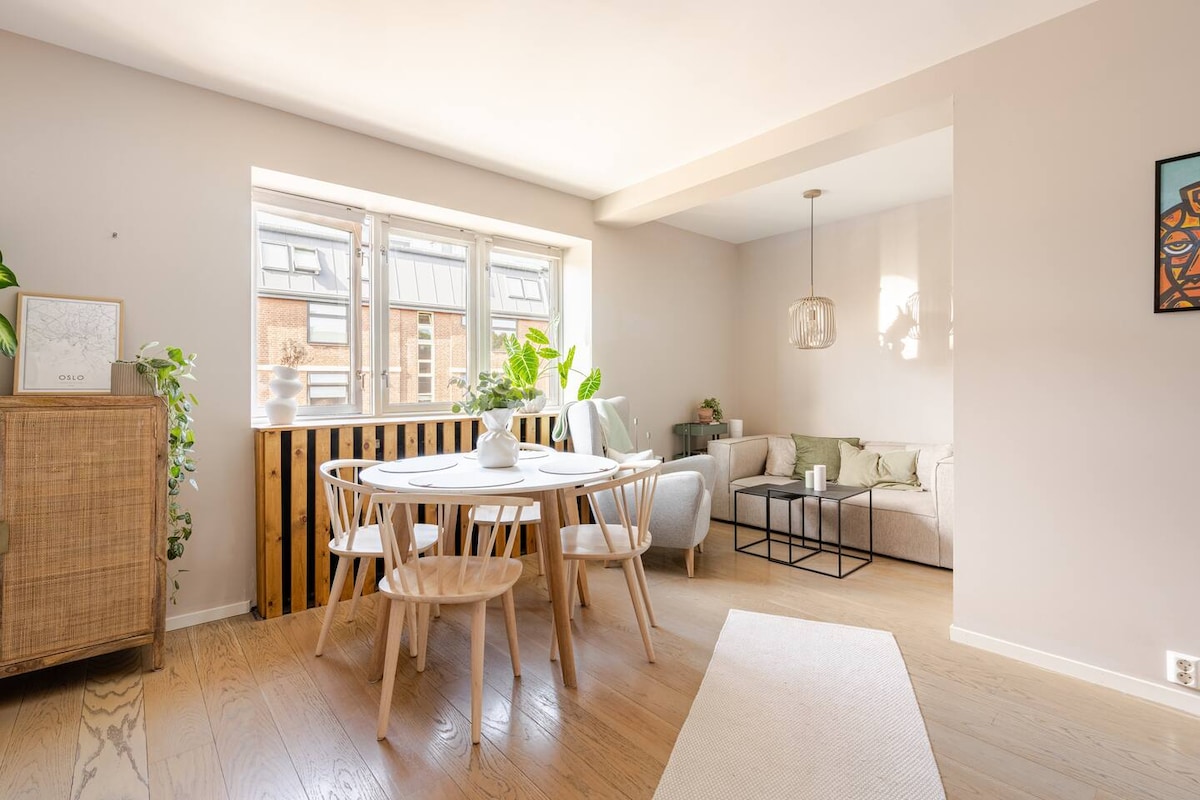 KOS deg i unike min toppleilighet. CHILL og privat atmosfære. DETTE STEDET (54kvm) er kun for deg. Friske blomster, drikke og telys er inkludert. Deilig dagslys. 4 takvindu- utvendige persienner kan brukes i perioden: April 1st-October 31st! Med HEIS er det lett å reise;) 12 min gange fra Oslo S (togstasjonen). 3 min til buss/trikk. Mulighet: leie innendørs parkering. NB: Innsjekk fra kl. 16.00, bookinger Back2Back Jeg viser deg rundt. 10 år som Superhost på Løkka. Gjeste favoritt ;D