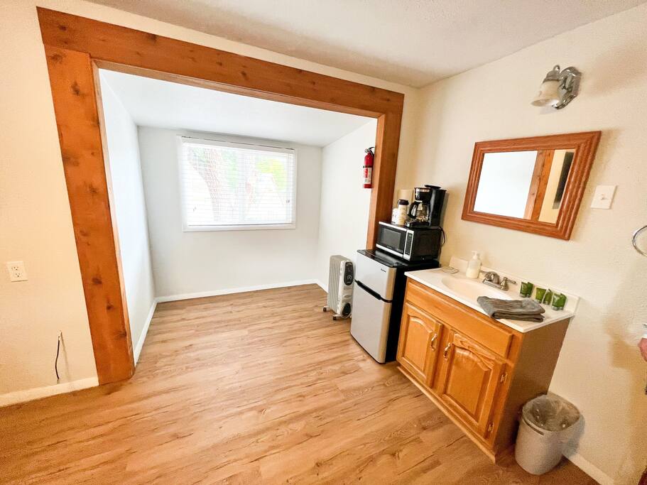 A 3 room suite plus private fenced patio w/propane fire pit & grill, surrounded by lush aspens, in a quieter darker area to enjoy the stars at night. Ravens' Off Main location is 4 walkable blocks to Main Street. Bathroom has double vanities, large shower, a huge soaking tub (no jets). Living room w/dish network, kitchenette with cooktop, microwave, refrigerator, washer/dryer, coffee maker, & countertop oven. Plenty of private parking. A non-pet room. see spaces 9,10,11,& 12 for pet stays.
