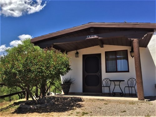 The Cholla (pronounced choy·uh) room is a private ground level room with one king bed, one detached shared bathroom, fireplace (one firelog is provided), kitchenette, private patio, and a frame tv. It can accommodate up to two adults, and one infant (up to two years of age).