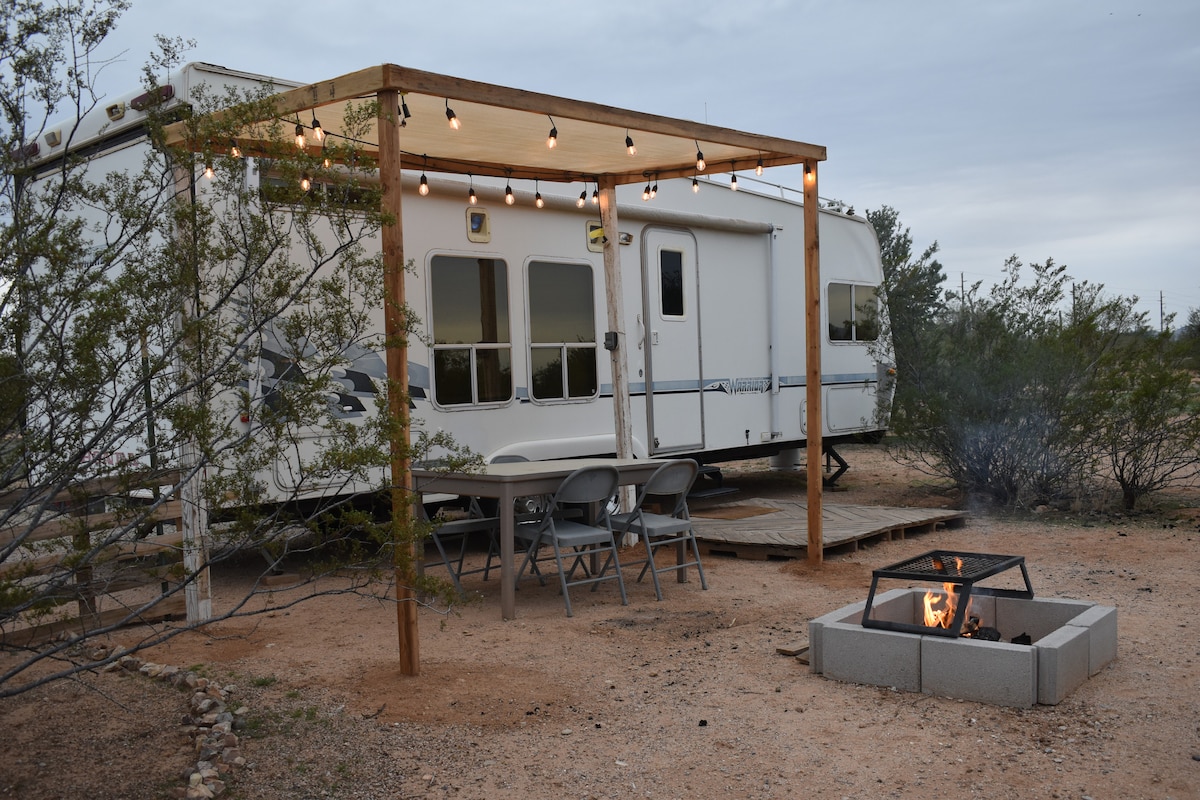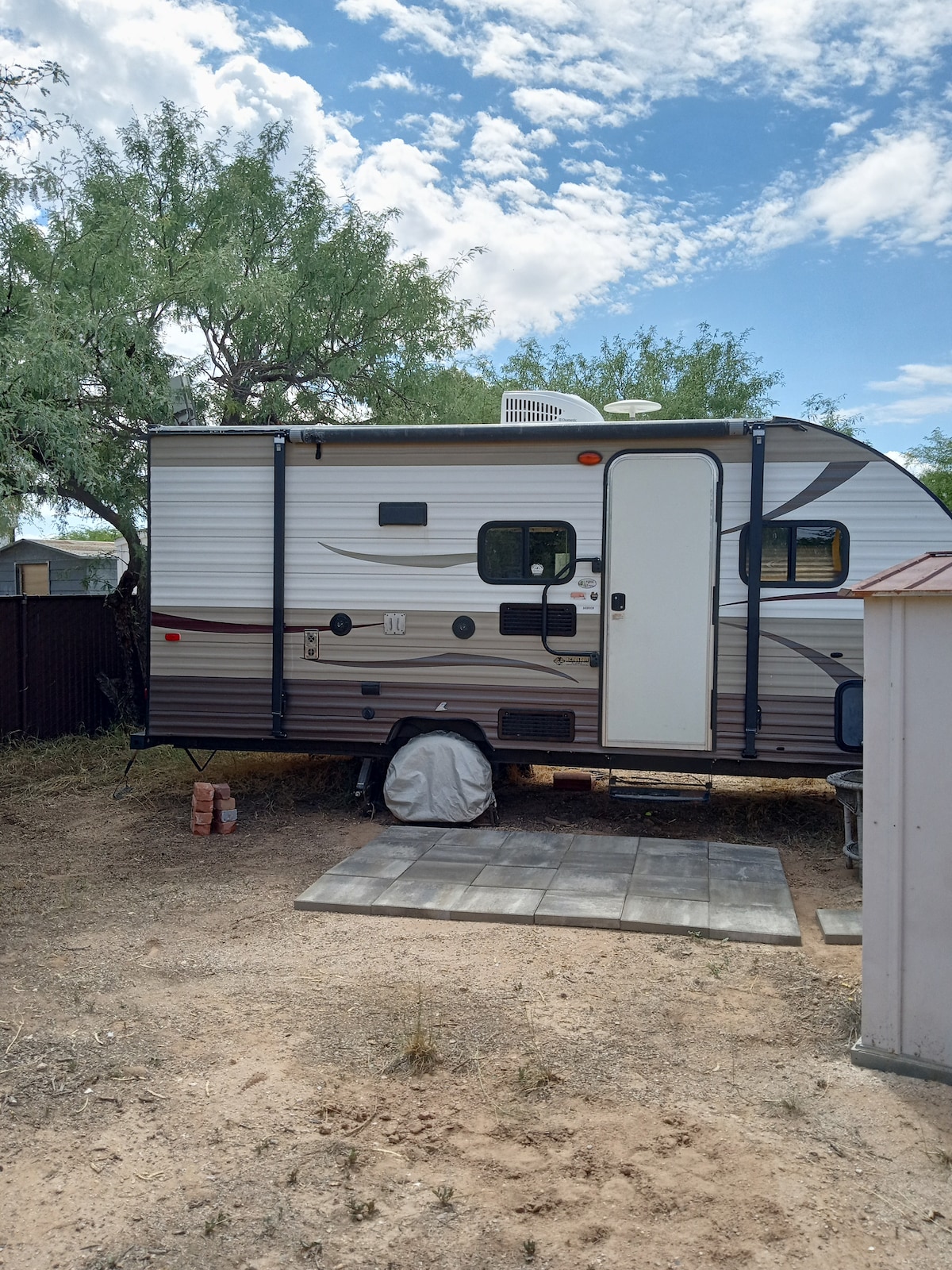 Outdoor feeling in the city. Our 14 feet cruiser fun finder is parked in the back of our lot in a quiet residential area in central Tucson. It is small, cozy and features everything you need for a comfortable stay: a queen bed, fully equipped kitchenette, minifridge, hot running water, heater, AC and a private bathroom with toilet and shower. We have a dining place with table and chairs set up outside. For cooler nights we'll provide a heater and a down comforter to keep you warm.