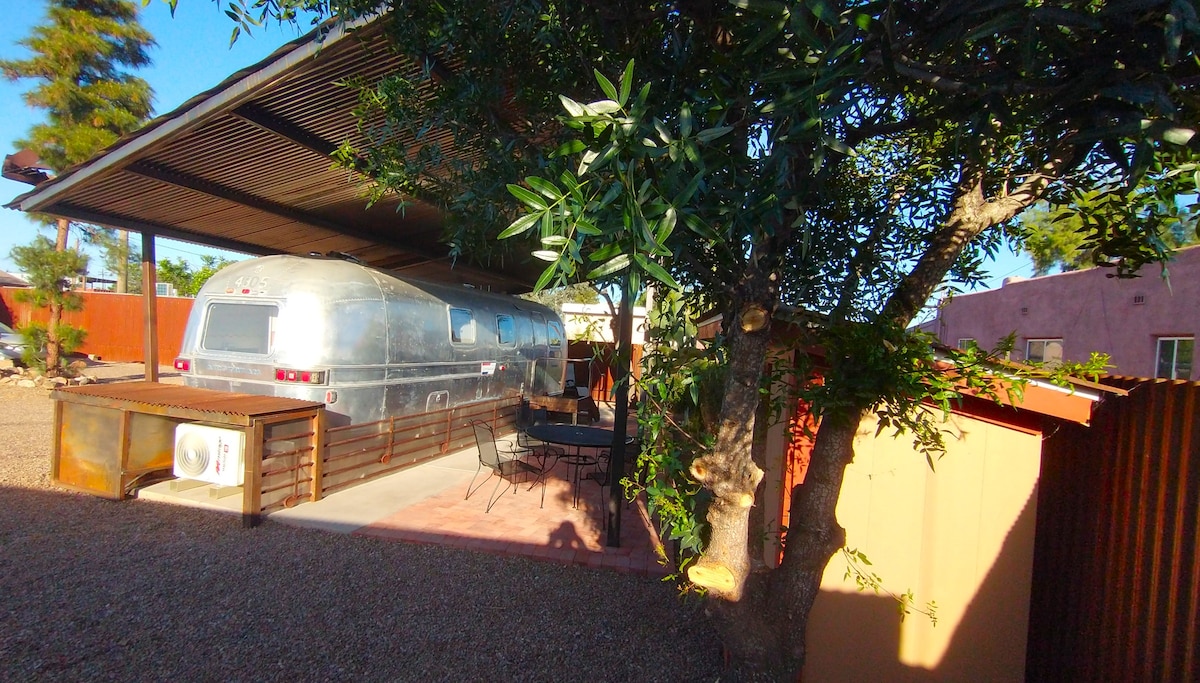 Charming 1961 vintage "retro" Airstream trailer with private garden. Cooking appliances, refrigerator, A/C, heater, DVD, hot shower, toilet. Great central location, "Glamping" in the middle of Tucson. Access to barbeque, outdoor kitchens, gardens. Sorry, the trailer is small and is designed for single occupancy - it's not suitable for a couple.