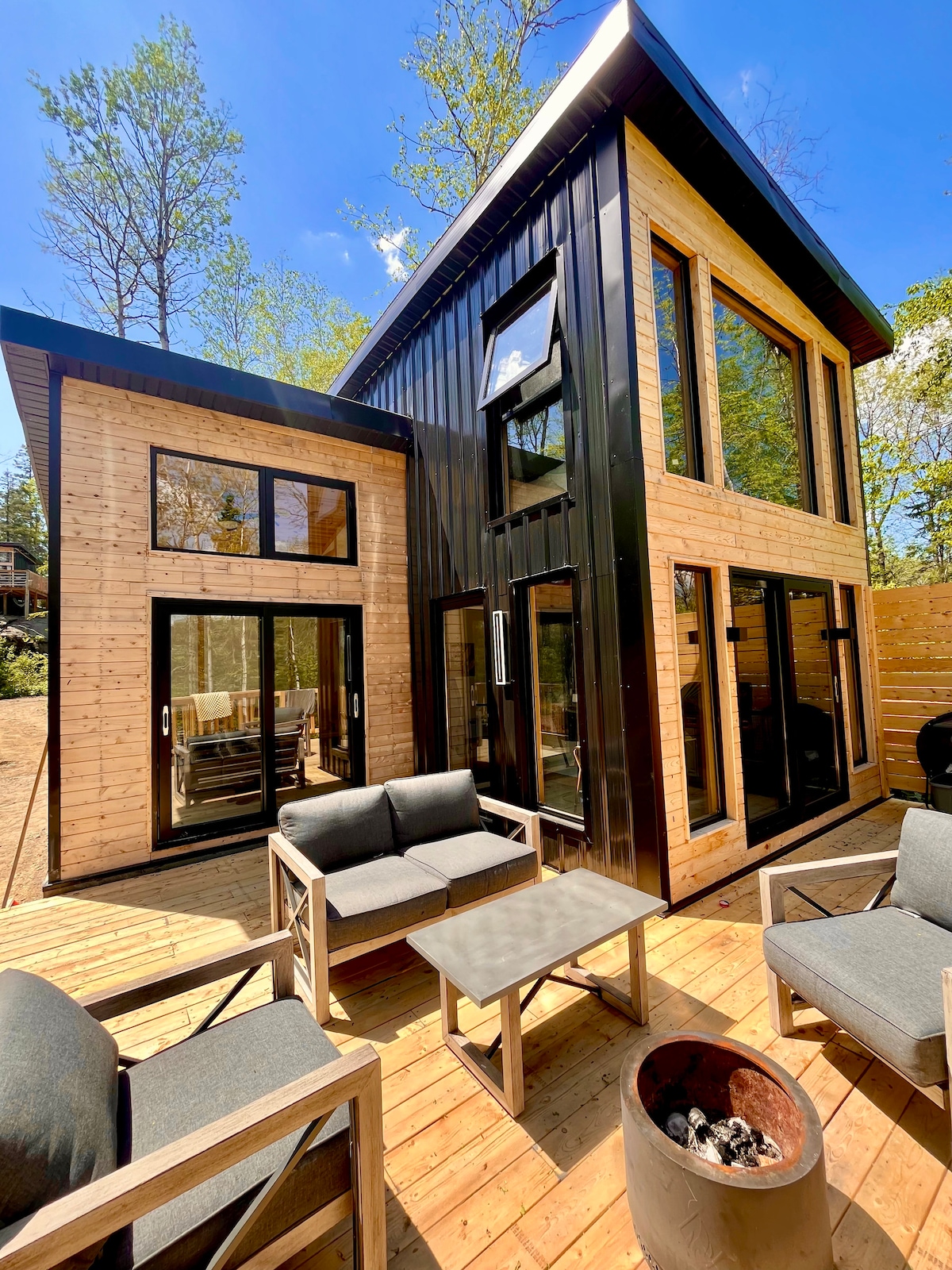 La résidence touristique Lodges des Bois vous offre tout le confort d’un chalet moderne en pleine nature Vous disposerez d’une cuisine équipée, une salle de bain avec douche multi jet, laveuse et sécheuse, une chambre avec 2 lits Queen dont un en mezzanine, un coin repas, un salon avec TV, banque de films ainsi qu’un lit Queen escamotable. Vous profiterez d'une grande terrasse avec vue sur le lac, équipée d’un barbecue, ainsi que d’un espace pour profiter des soirées été autour d’un feu de bois