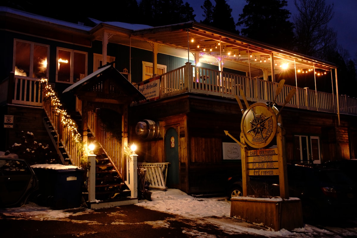 Chambre intime et confortable avec lit double et lavabo avec vue sur le pittoresque village, dans l'auberge Rose des Vents. Située dans le village pittoresque de Sainte-Rose-du-Nord, l’Auberge vous propose de l’hébergement, un restaurant mettant à l’honneur les producteurs locaux, un café bar, des activités de plein air et vous présente une scène culturelle variée. Tout ça au même endroit!