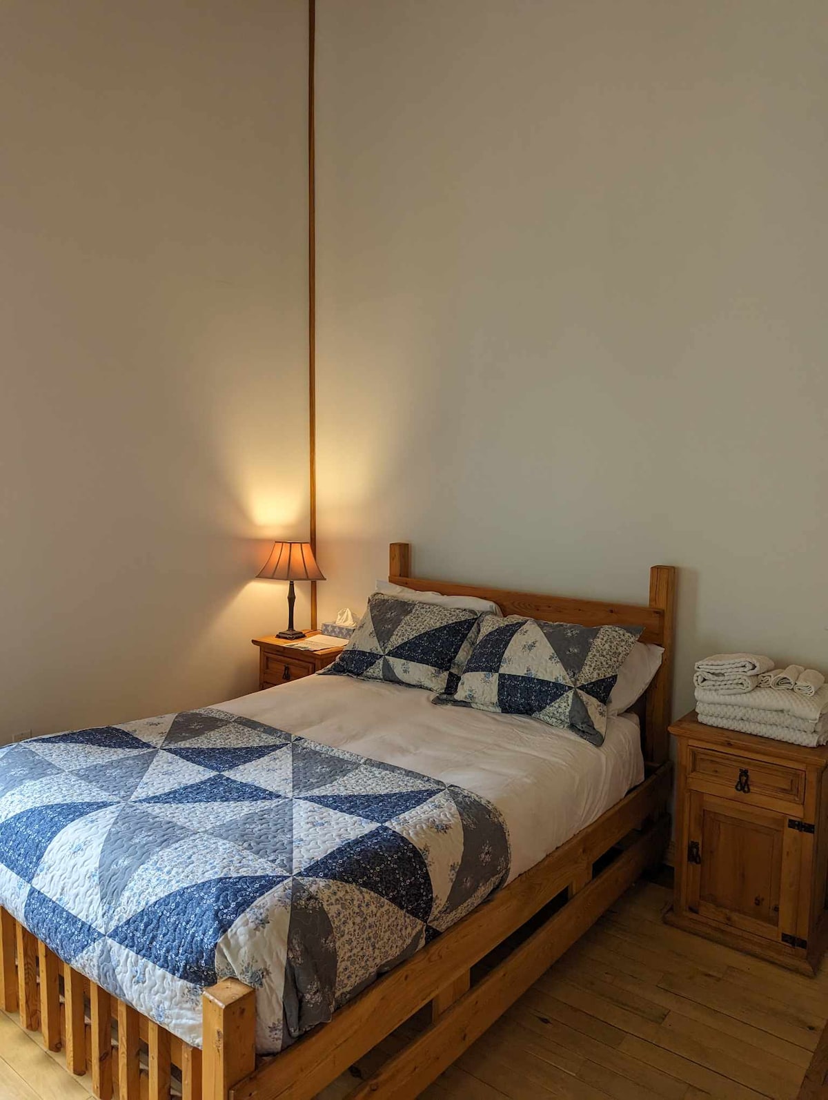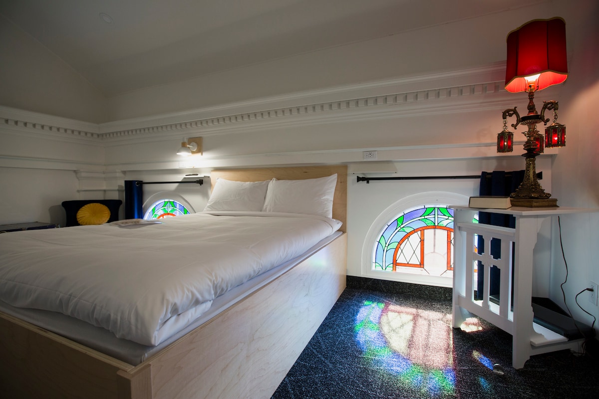 La chambre standard est une chambre à occupation double, située au deuxième étage et accessible par un escalier. L’arrivée se fait de manière autonome. Chaque chambre dispose d’un lit queen collé au mur, d’une chaise, d’une table de chevet, d’une salle de bain privée avec grande douche et toilette, d’un minibar et d’une télévision (sans service de câble, mais compatible avec les plateformes de streaming). Une vue sur l’un des vitraux complète l’ambiance unique de l’espace. # CITIQ: 314013