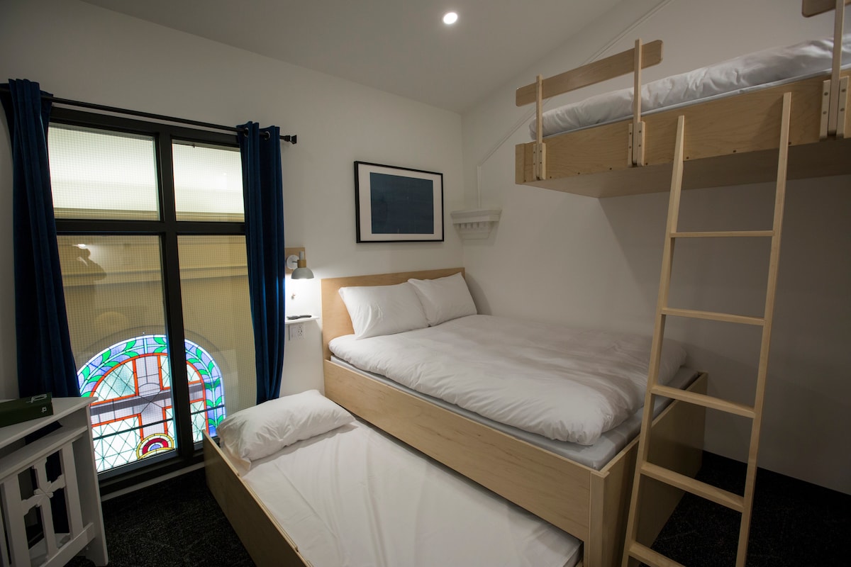 La chambre familiale accueille jusqu’à quatre personnes. Située au deuxième étage et accessible par escalier, l'arrivée se fait de façon autonome. Elle comprend un lit queen collé au mur, un lit simple superposé et un lit simple tiroir. On y retrouve une chaise, une salle de bain privée avec grande douche et toilette, un minibar et une télévision (sans câble, mais compatible avec les plateformes de streaming). Une vue sur un vitrail complète l’ambiance unique. # CITIQ: 314013