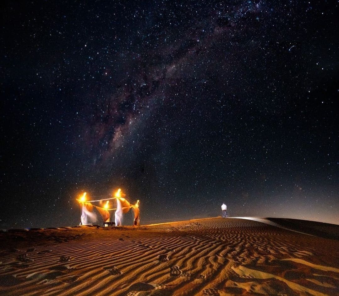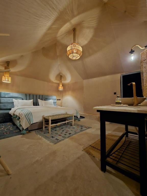 This luxurious desert camp is easily accessible by car. Despite its proximity to the village, it's situated right in the middle of the sand dunes, offering a panoramic view of some of the largest dunes. As locals, we can arrange activities and accommodate any additional requests. We provide private tents, each with its own bathroom, toilet, and air conditioning for both cooling and heating. We also offer dinner upon request. Everyone is welcome in the desert.