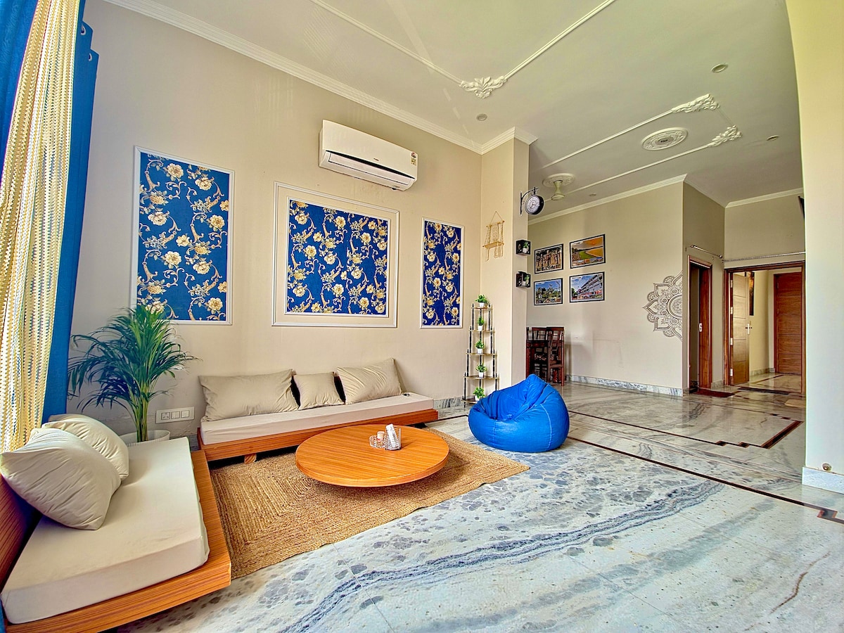 Property by - Samāvas Airbnb The Space ● 3 bedrooms, 3 bathrooms - sleeps 6 guests ● Modern furnished with AC and WiFi ● Full kitchen and living area Special Features ● Private terrace with fireplace ● Free parking Amenities ● Fresh linens and towels ● Kitchen essentials provided ● Smart TV ● Washing machine Location ● Park-facing quiet area ● Near restaurants and shops ● Airport approx 2kms Perfect For ● Families with children ● Business travelers ● Weekend getaways and Chill