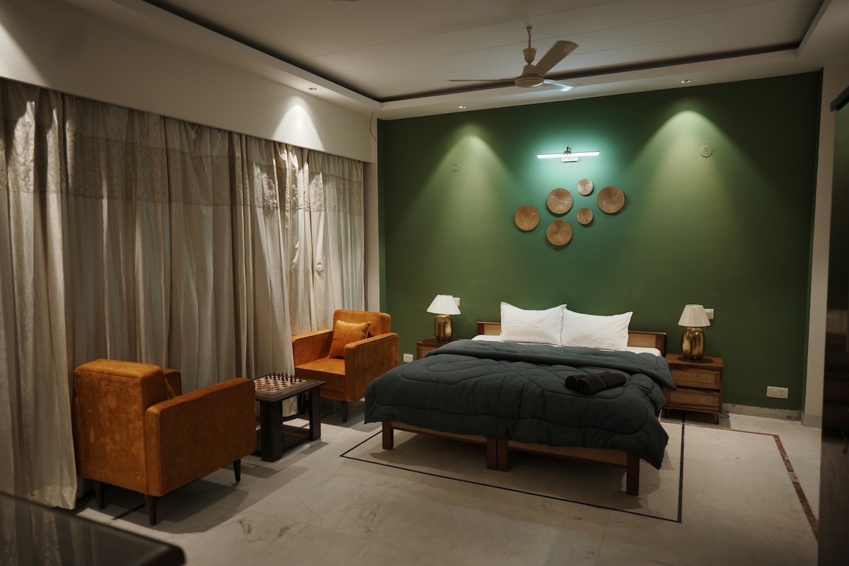 Step into a vibrant blend of tradition and modernity at our thoughtfully designed apartment, where teal-toned interiors meet a curated collection of Indian art. Adorned with stunning Madhubani paintings, abstract artworks, and prints sourced from across Jaipur, this space is a visual journey through heritage and creativity. Whether you are a solo traveler, a couple, or an art loving explorer, this apartment offers a cozy yet stylish setting with all the comforts of a modern stay.