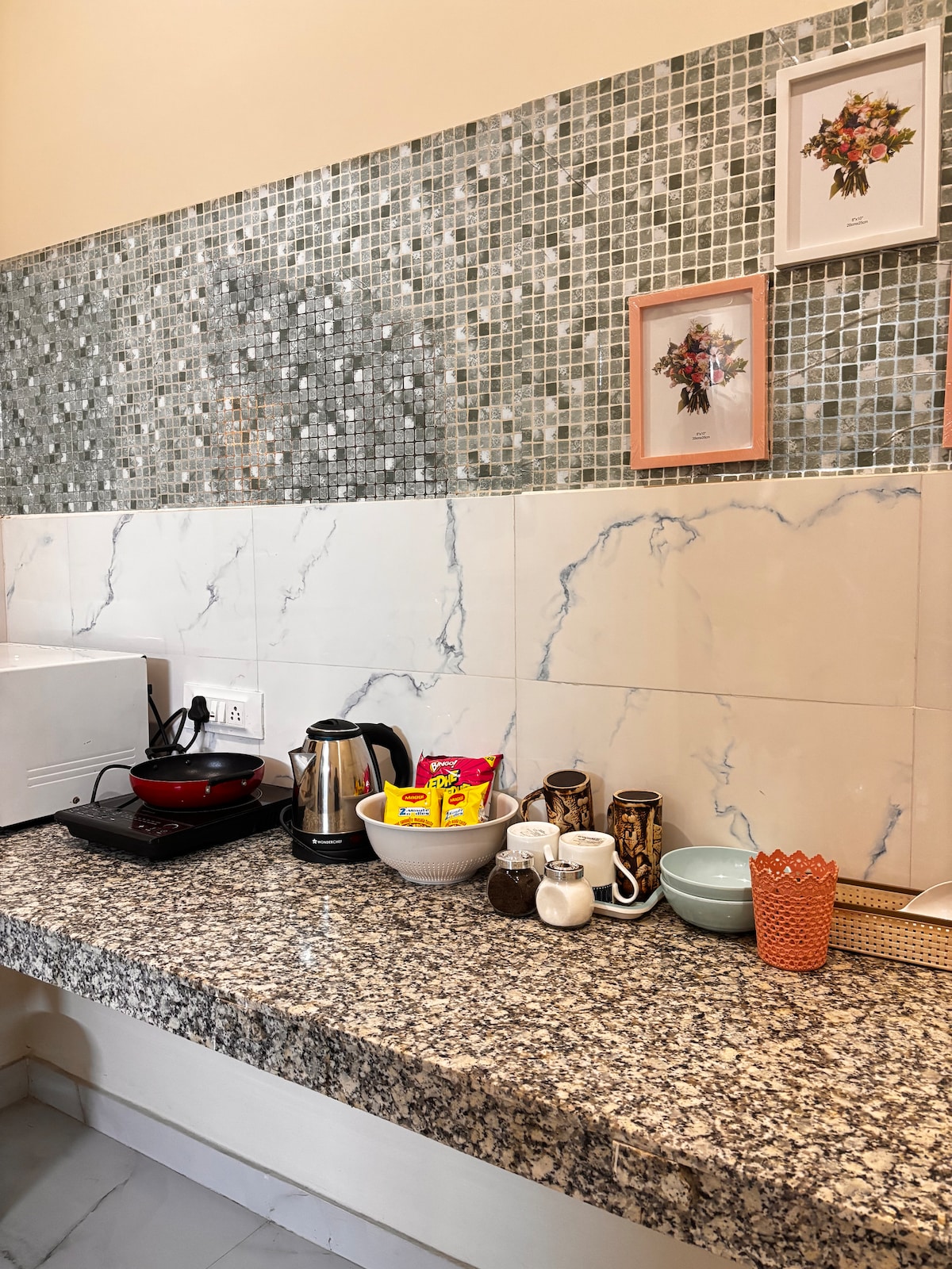 This open-plan studio apartment follows minimalistic design principles. Equipped with a kitchenette, two bathrooms, a full-sized King bed, a queen size Wall Bed, TV with Netflix, Hotstar, PrimeVideo, JioCinema and free WiFi, this space is capable of comfortably hosting a family of four. Please NOTE: This is an open plan apartment, and there are NO private bedrooms, the apartment is on the second floor, so you’ll need to go up two flights of stairs. NO PARTIES PLEASE 🙏🏽 and NO SMOKING 🚭