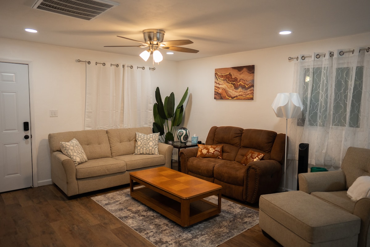 Our very clean 2 bedroom 2 bath home features a zero gravity massage chair, comfortable mattresses, soft throws, a fully stocked kitchen, fast wifi, and convenient USB ports in 3 rooms. The neighborhood has a community pool, hot tub, gym access, walking trail and ramadas to name a few! This home sleeps 6, has a private backyard, and 2 covered parking spaces. Right around the corner from the grocery store, movie theater, and multiple golf courses! This clean and relaxing space is sure to impress!