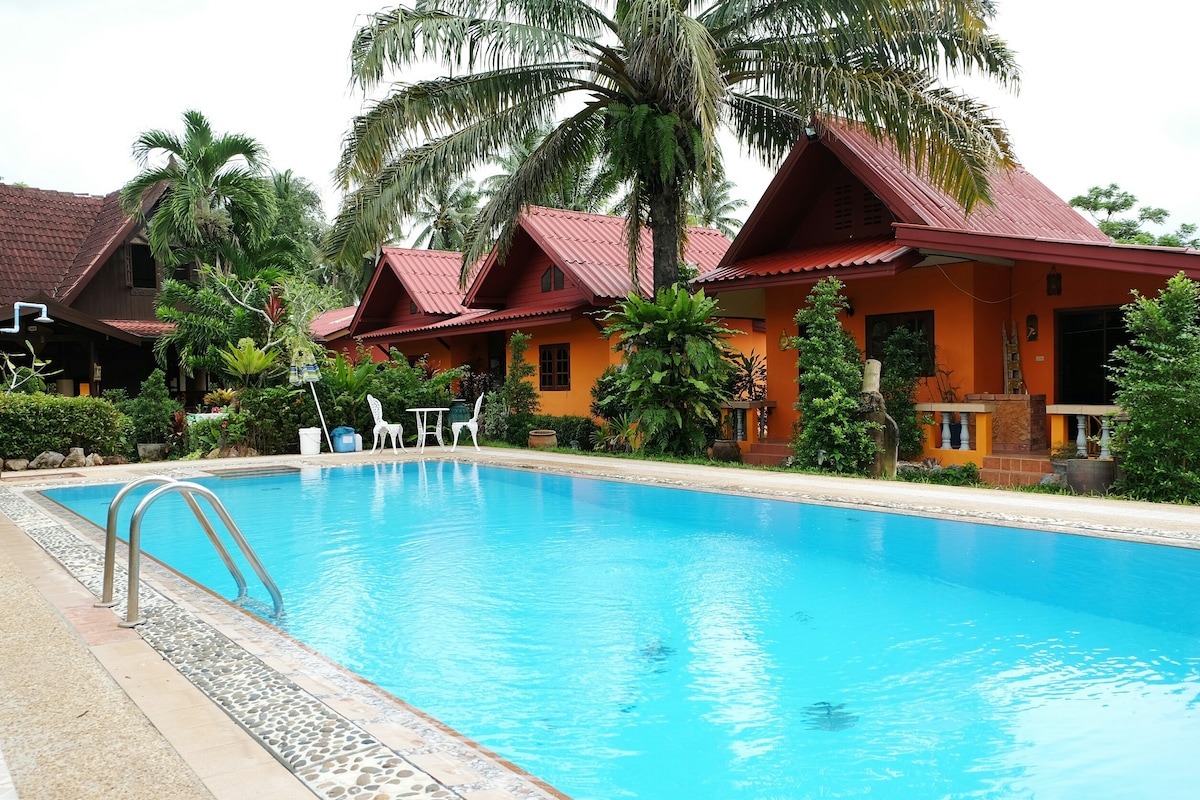The bungalow is private (only one bungalow) with bathroom on-suite – it is built over a fish pond and adjacent to a beautiful creek and bird aviaries. It is situated in a semi-rural Thai farmstay / getaway with outdoor activities & sights such as – • Kayaking * • Cycling * • Fishing * • Swimming • Walking • Large vegetable garden • Free range domestic animals • Creek with fabulous swimming • Mountain views • Rural Thai activities eg rubber tapping Refer Ecovilla 2 adjacent hse appox 100m away