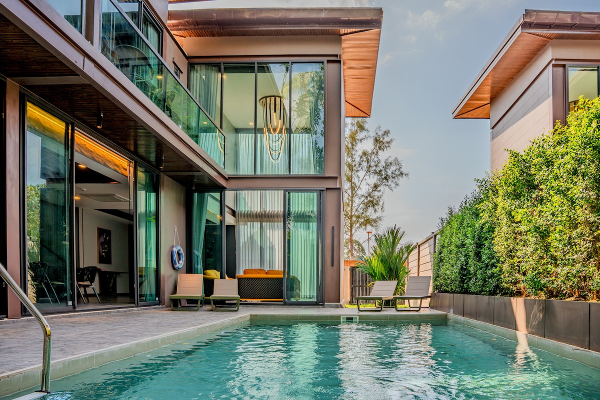 Luxury Modern Pool Villa | Tropical Hideaway Step into your own modern sanctuary, where clean architecture, floor-to-ceiling glass, and lush tropical greenery come together to create a calm, stylish escape. This pool villa is perfect for couples, families, or small groups looking for comfort, and understated luxury—just far enough away to feel peaceful, yet close to everything you need.