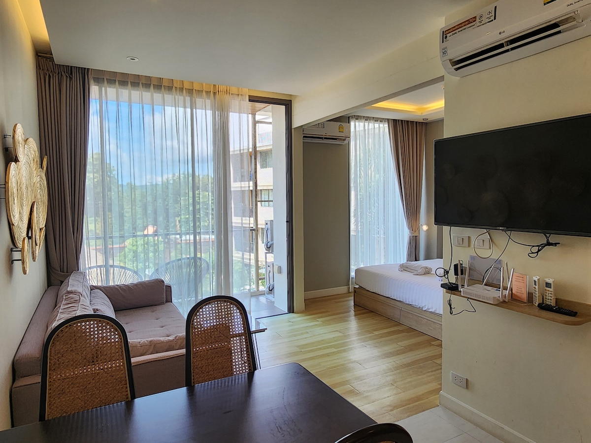 Ideal relax for Couples and Family. Sunny apartment with the best location in Ao Nang - 7 minutes walk from 2 beaches - Noppharathara and Ao Nang. It has an airconditioned bedroom with comfortable king size bed, separated from the living room with a sliding door. Convertible sofa allows the accommodation of two more guests. Fully equipped kitchen and dining area with TV. A balcony with a view of a green hill full of birds. Common pool, sauna and gym.